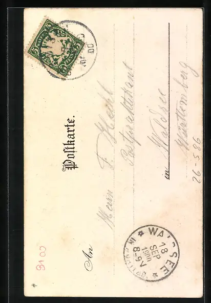 Personenbezogene Daten auf der Rückseite der Karte wurden durch blauen Textmarker unkenntlich gemacht. Die blauen Stellen sind auf die Vorderseite durchgeweicht und wirken sich negativ auf das Postkartenfoto aus