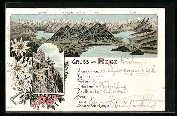 Lithographie Rigi, Alpenpanorama mit See