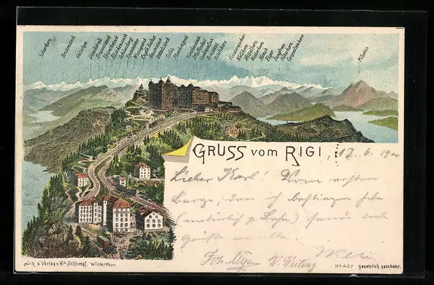Lithographie Rigi, Hotels auf dem Rigi, Totalansicht