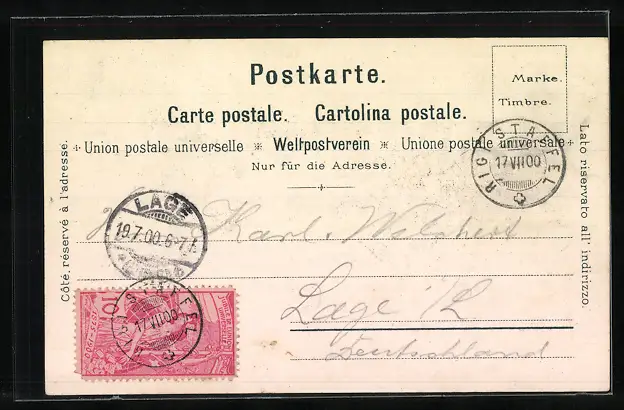 Personenbezogene Daten auf der Rückseite der Karte wurden durch blauen Textmarker unkenntlich gemacht. Die blauen Stellen sind auf die Vorderseite durchgeweicht und wirken sich negativ auf das Postkartenfoto aus