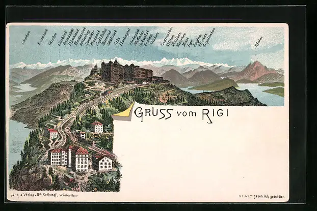 Lithographie Rigi, Ortsansicht aus der Vogelschau mit Bergpanorama