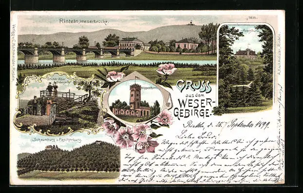 Lithographie Rinteln, Weserbrücke, Kloppenthurm, Arensburg