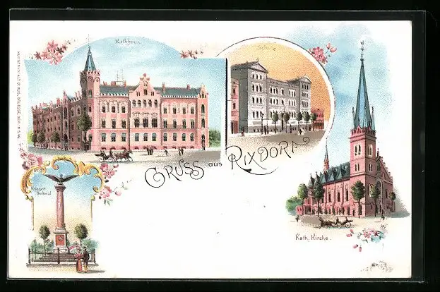 Lithographie Rixdorf, Rathaus, Katholische Kirche, Schule