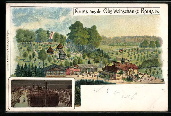 Lithographie Rötha /Sa., Gasthaus Obstweinschänke mit Umgebung, Weinkeller