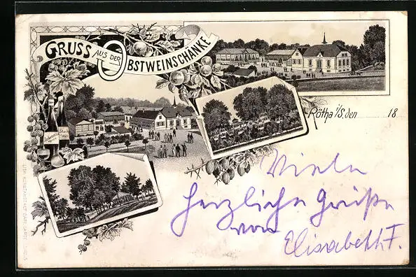 Lithographie Rötha i /S., Gasthaus Obstweinschänke, Pavillon, Ortspartie
