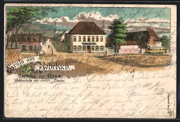 Lithographie Rohrbach, Gasthaus zur Rose, Strassenbahn