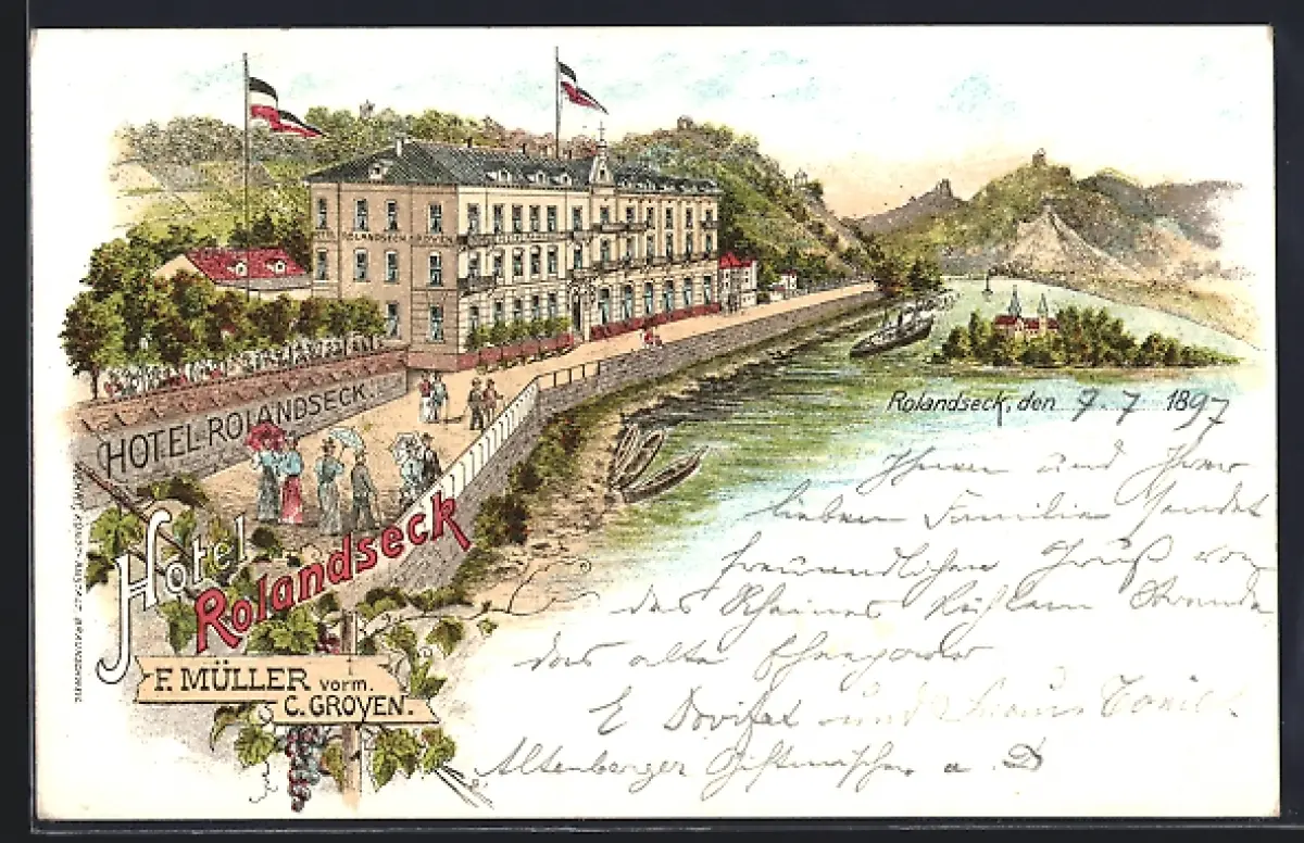 Lithographie Rolandseck, Hotel Rolandseck, Bes. F. Müller