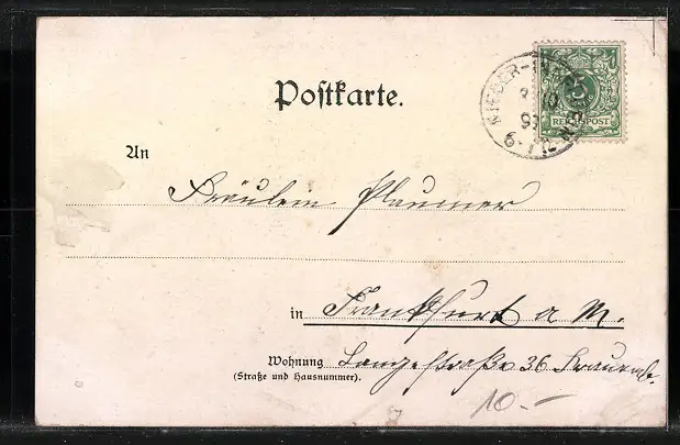 Personenbezogene Daten auf der Rückseite der Karte wurden durch blauen Textmarker unkenntlich gemacht. Die blauen Stellen sind auf die Vorderseite durchgeweicht und wirken sich negativ auf das Postkartenfoto aus