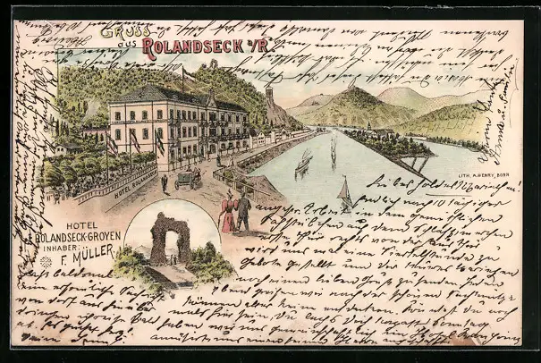 Lithographie Rolandseck a. R., Hotel Rolandseck-Groyen F. Müller mit Uferstrasse und Fluss-Insel, Ruine