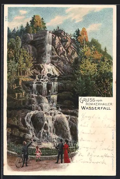 Lithographie Romkerhaller Wasserfall, Partie mit Besuchern