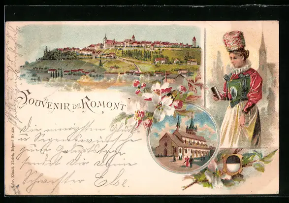 Lithographie Romont, Teilansicht, Gebäudeansicht, Frau in Tracht