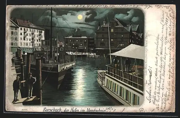Personenbezogene Daten auf der Rückseite der Karte wurden durch blauen Textmarker unkenntlich gemacht. Die blauen Stellen sind auf die Vorderseite durchgeweicht und wirken sich negativ auf das Postkartenfoto aus