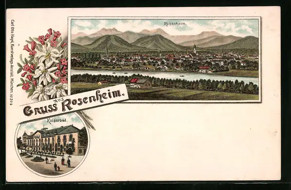 Lithographie Rosenheim, Hotel Kaiserbad, Teilansicht