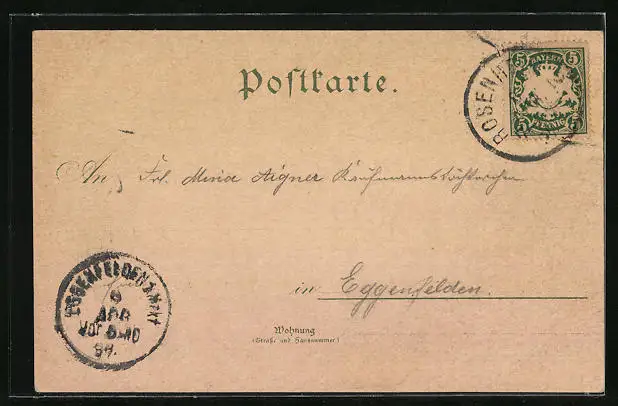 Personenbezogene Daten auf der Rückseite der Karte wurden durch blauen Textmarker unkenntlich gemacht. Die blauen Stellen sind auf die Vorderseite durchgeweicht und wirken sich negativ auf das Postkartenfoto aus