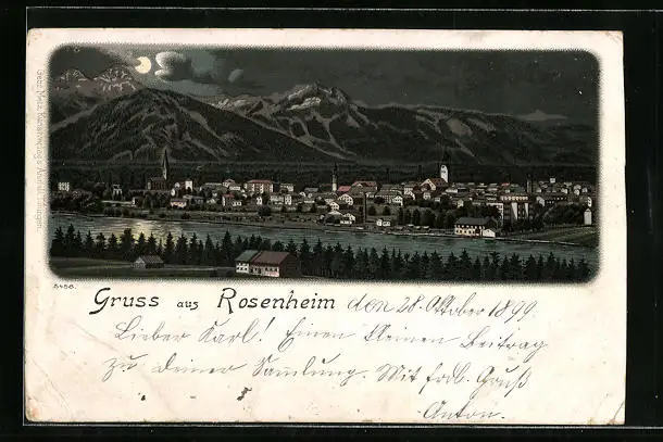 Lithographie Rosenheim, Ortsansicht über den Fluss