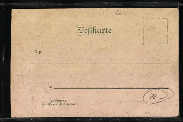 Personenbezogene Daten auf der Rückseite der Karte wurden durch blauen Textmarker unkenntlich gemacht. Die blauen Stellen sind auf die Vorderseite durchgeweicht und wirken sich negativ auf das Postkartenfoto aus
