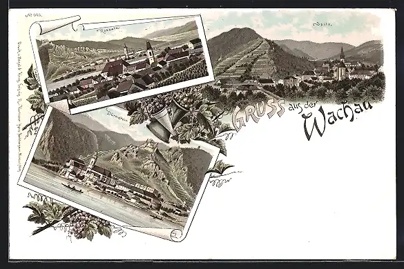 Lithographie Rossatz /Wachau, Ortsansicht mit Dürnstein