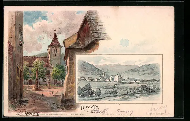 Lithographie Rossatz a / d. Donau, Teilansicht, Ortspartie mit Kirche