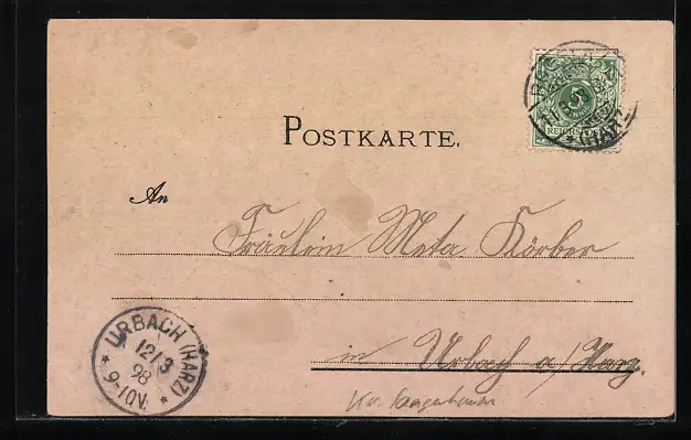 Personenbezogene Daten auf der Rückseite der Karte wurden durch blauen Textmarker unkenntlich gemacht. Die blauen Stellen sind auf die Vorderseite durchgeweicht und wirken sich negativ auf das Postkartenfoto aus