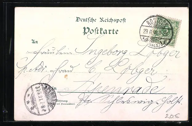 Personenbezogene Daten auf der Rückseite der Karte wurden durch blauen Textmarker unkenntlich gemacht. Die blauen Stellen sind auf die Vorderseite durchgeweicht und wirken sich negativ auf das Postkartenfoto aus
