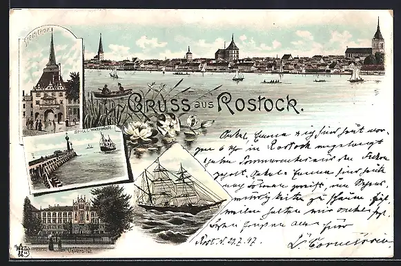 Lithographie Rostock, Steinthor, Universität und Spill i. Warnemünde
