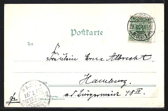 Personenbezogene Daten auf der Rückseite der Karte wurden durch blauen Textmarker unkenntlich gemacht. Die blauen Stellen sind auf die Vorderseite durchgeweicht und wirken sich negativ auf das Postkartenfoto aus