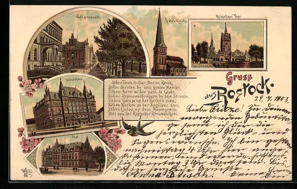 Lithographie Rostock, Wallpromenade, Ständehaus, Kröpeliner Thor
