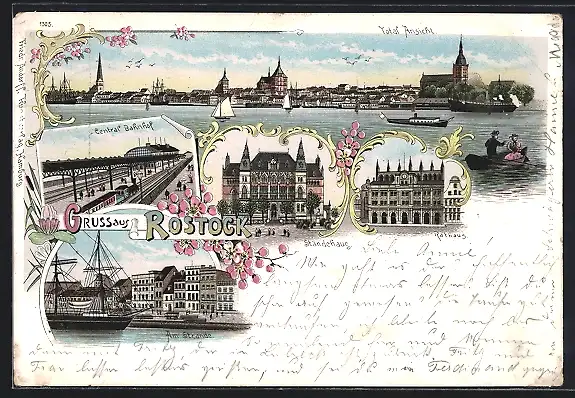 Lithographie Rostock i. M., Zentralbahnhof, Ständehaus, Rathaus, Totalansicht