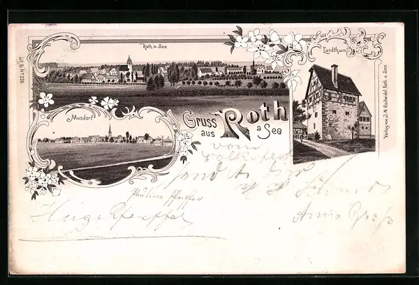 Lithographie Roth a. See, Ortsansicht, Musdorf, Landturm