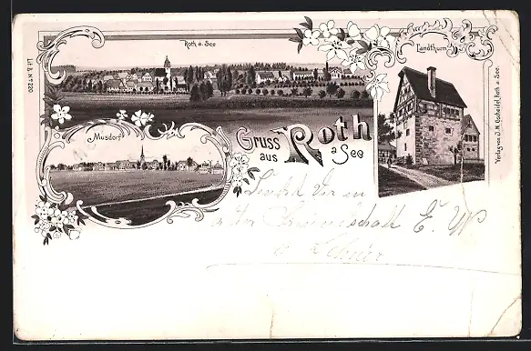 Lithographie Roth a. See, Ortsansicht, Musdorf, Landturm