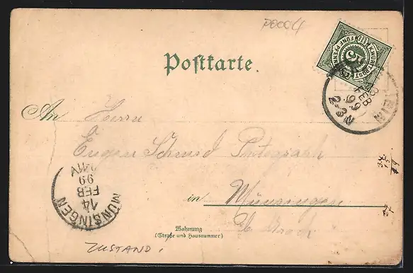 gelaufen 1899, Eckknicke rechts, Einriss unten, guter Zustand