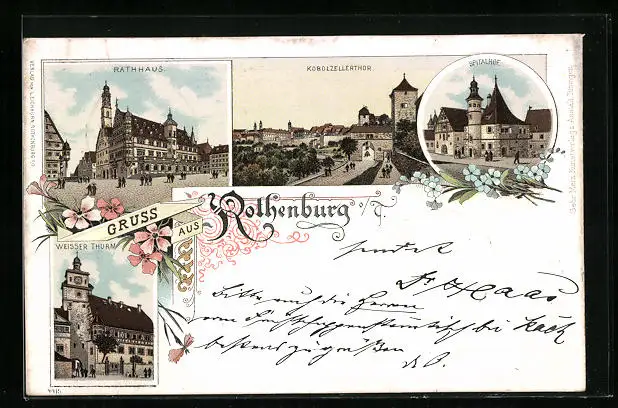 Lithographie Rothenburg o. T., Rathaus, Spitalhof, Weisser Turm
