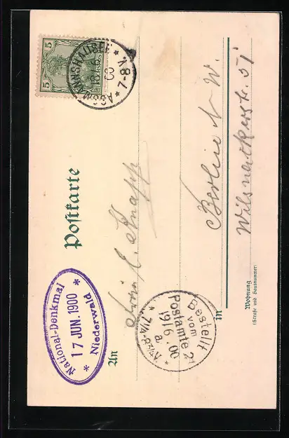 Personenbezogene Daten auf der Rückseite der Karte wurden durch blauen Textmarker unkenntlich gemacht. Die blauen Stellen sind auf die Vorderseite durchgeweicht und wirken sich negativ auf das Postkartenfoto aus