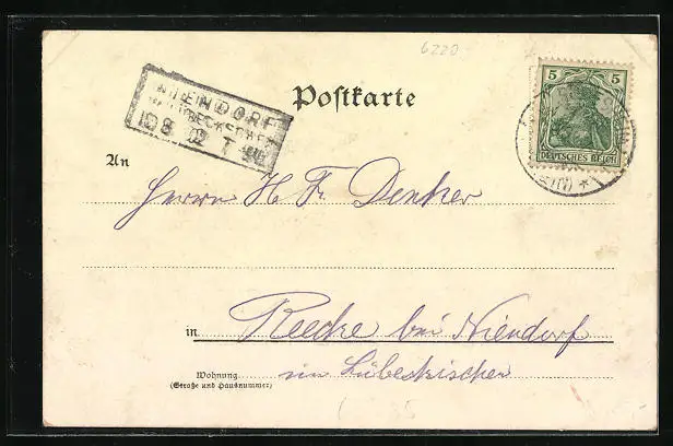 Personenbezogene Daten auf der Rückseite der Karte wurden durch blauen Textmarker unkenntlich gemacht. Die blauen Stellen sind auf die Vorderseite durchgeweicht und wirken sich negativ auf das Postkartenfoto aus