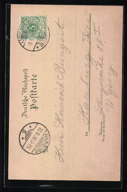 Personenbezogene Daten auf der Rückseite der Karte wurden durch blauen Textmarker unkenntlich gemacht. Die blauen Stellen sind auf die Vorderseite durchgeweicht und wirken sich negativ auf das Postkartenfoto aus