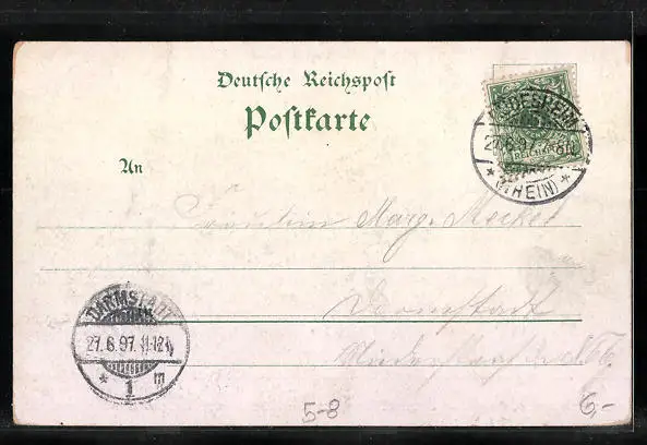 Personenbezogene Daten auf der Rückseite der Karte wurden durch blauen Textmarker unkenntlich gemacht. Die blauen Stellen sind auf die Vorderseite durchgeweicht und wirken sich negativ auf das Postkartenfoto aus