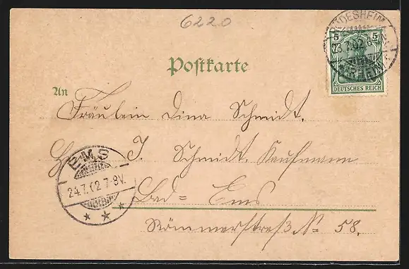 Personenbezogene Daten auf der Rückseite der Karte wurden durch blauen Textmarker unkenntlich gemacht. Die blauen Stellen sind auf die Vorderseite durchgeweicht und wirken sich negativ auf das Postkartenfoto aus