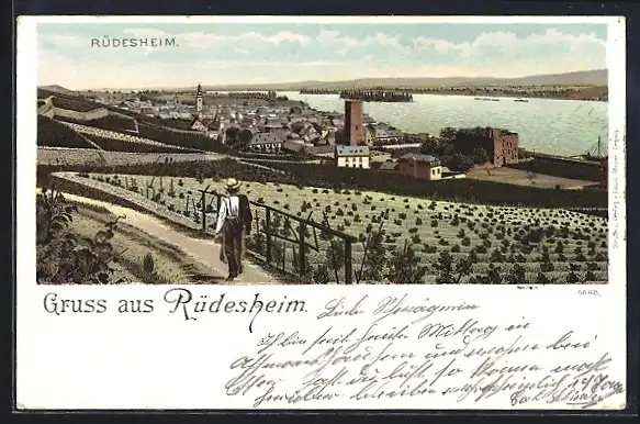 Lithographie Rüdesheim / Rhein, Panorama mit Uferpartie