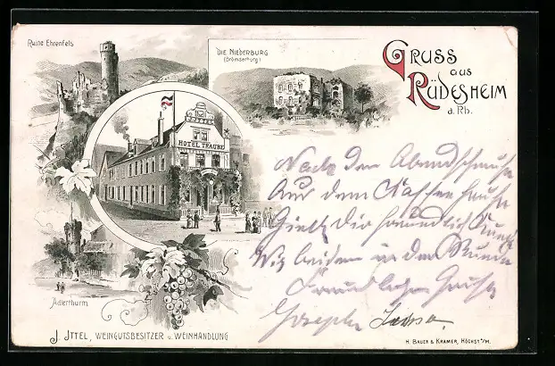 Lithographie Rüdesheim /Rhein, Strassenpartie mit Hotel Traube, Adlerturm, Niederburg