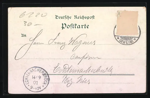gelaufen 1901, Briefmarke entfernt, rückseitig Oberflächenschaden, Ecken bestoßen, Eckknick oben re., guter Zustand