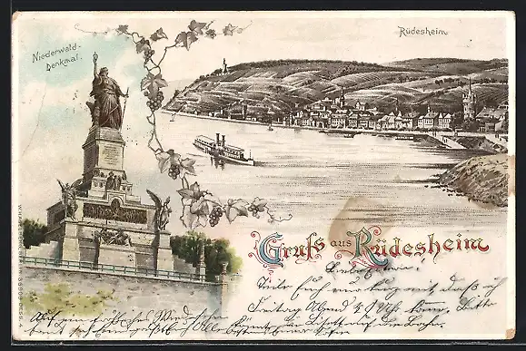 Lithographie Rüdesheim / Rhein, Teilansicht, Niederwald-Denkmal