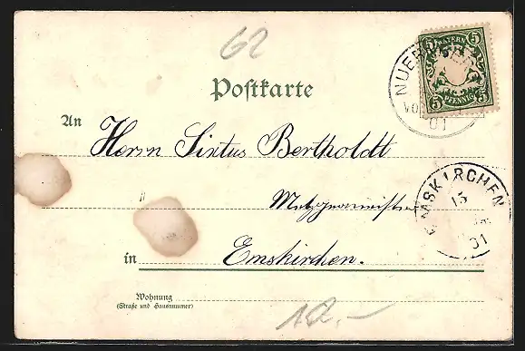 Personenbezogene Daten auf der Rückseite der Karte wurden durch blauen Textmarker unkenntlich gemacht. Die blauen Stellen sind auf die Vorderseite durchgeweicht und wirken sich negativ auf das Postkartenfoto aus
