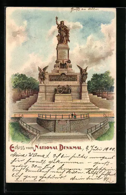 Lithographie Rüdesheim a. Rhein, National-Denkmal, Totalansicht