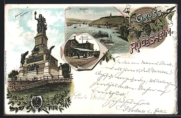 Lithographie Rüdesheim am Rhein, Ortsansicht mit Nationaldenkmal und Bahnhof