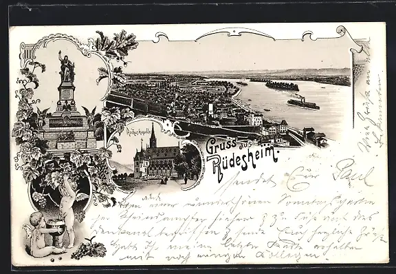 Lithographie Rüdesheim am Rhein, Totalansicht, Rochuskapelle