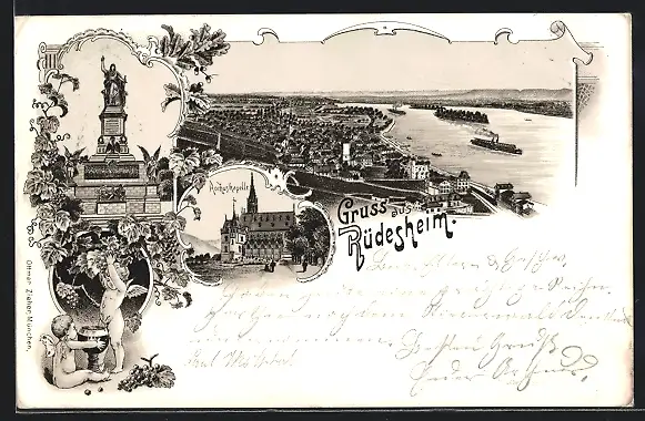 Lithographie Rüdesheim am Rhein, Totalansicht, Rochuskapelle