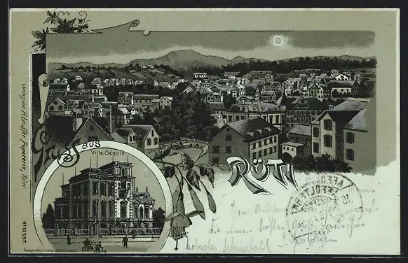 Lithographie Rüti, Ansicht der Villa Séquin, Blick über die Dächer der Ortschaft