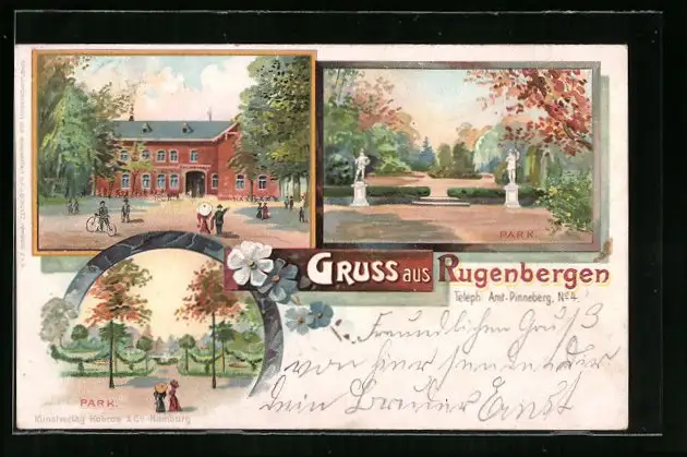 Lithographie Rugenbergen, Gasthaus Rugenbergen, Parkpartien
