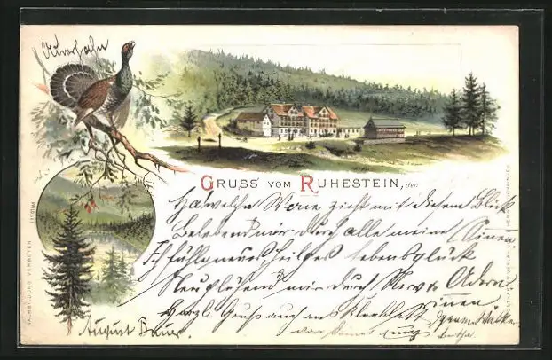 Lithographie Ruhestein, Ortspartie, Uferpartie