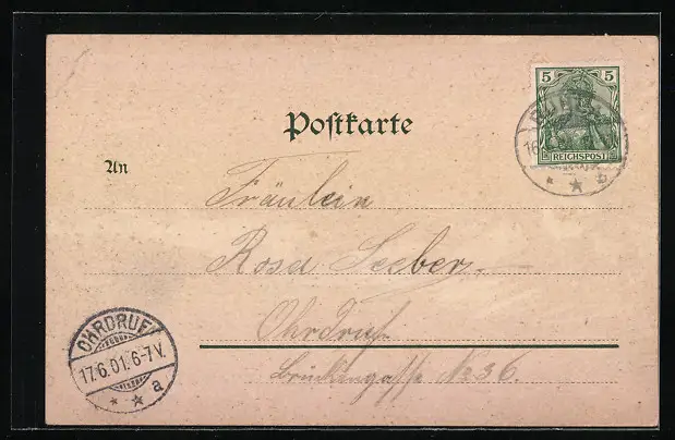 gelaufen 1901, Eckknicke oben, Klebe- und Papierreste li. oben, guter Zustand